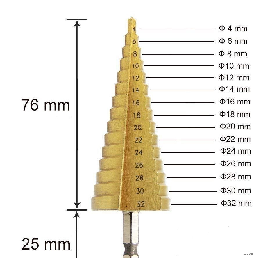 • Ступені свердління: 4мм, 6мм, 8мм, 10мм, 12мм, 14мм, 16мм, 18мм, 20мм, 22мм, 24мм, 26мм, 28мм, 30мм, 32мм.: